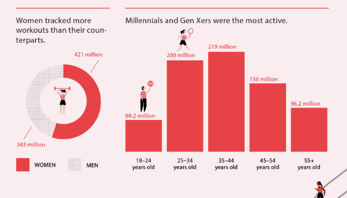Millennials and Gen Xers were the most active age group in 2016. Those aged 25-44 logged 57 percent of the total workouts logged from all users. Most popular workout? Running, duh! Although hiking has the largest jump as a growing-in-popularity outdoor activity. People averaged around a 5K per day in 2016.