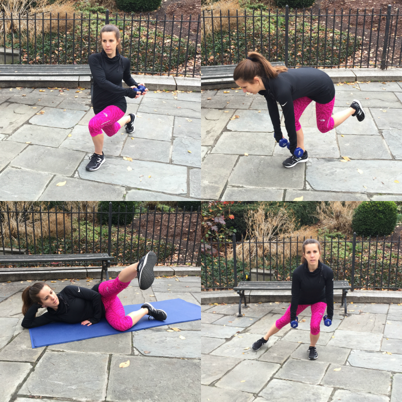 Reverse Lunge with Rotation (top left): Start standing with both feet together. Step one leg back and bend both knees to 90 degrees. Extend arms straight out in front and rotate towards the front knee. Bring the back leg forward to meet the front leg as you rotate your torso back to center.