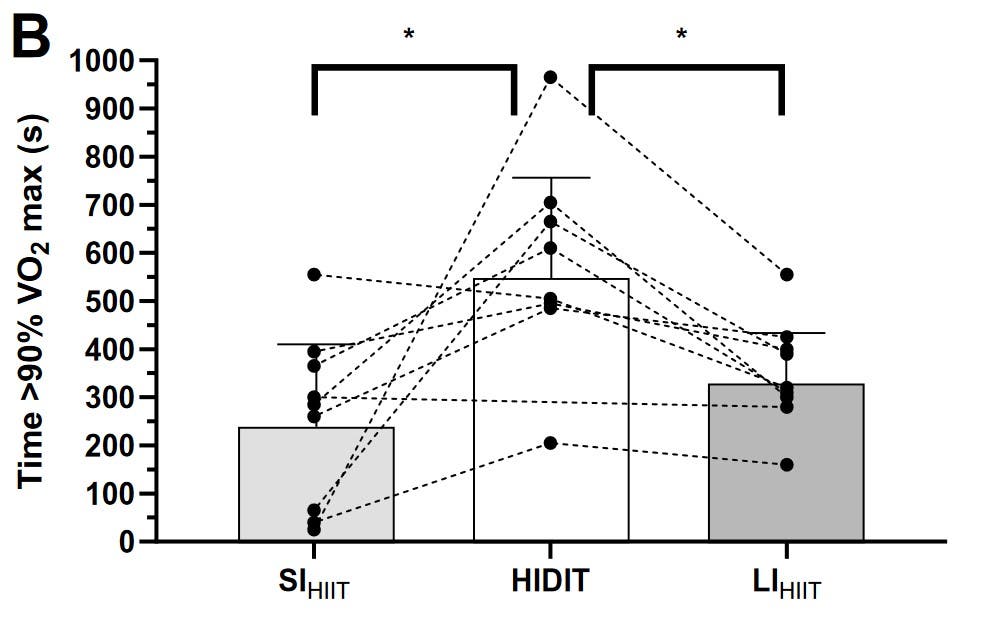 The results were, once again, impressive. Here’s a graph showing the total amount of time spent above 90 percent of VO2 max, which is a zone that’s thought to stimulate big fitness gains. On the left is short intervals (SI); in the middle is the ladder workout, which they call “high intensity decreasing interval training,” or HIDIT; on the right is long intervals (LI).